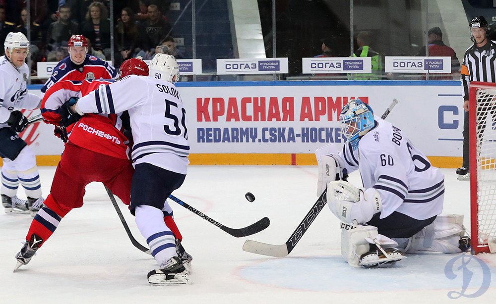 Первый период матча начался очень бодро, ЦСКА наседал на ворота Бочарова, динамовцы держали оборону и периодически остро контратаковали. И если по броскам преимущество было у армейцев, то в силовых приемах преуспевали динамовцы, тем самым давая понять, что легкой прогулки у хозяев не будет. Как сказал на одной из пресс-конференций главный тренер «Динамо» Владимир Анатольевич Воробьев, в современном хоккее ключевую роль играет игра в неравных составах. И именно она во многом определила исход сегодняшнего матча. Егор Зайцев получил две минуты за нарушение в своей зоне, спорное по мнению многих болельщиков, и первое же большинство красно-синих привело к изменению в счете, Антон Бурдасов был точен на добивании, 1-0. В конце периода Сергей Андронов опасно атаковал ворота Бочарова с убойной позиции, но Иван отлично сыграл ловушкой, отведя угрозу от своих ворот.